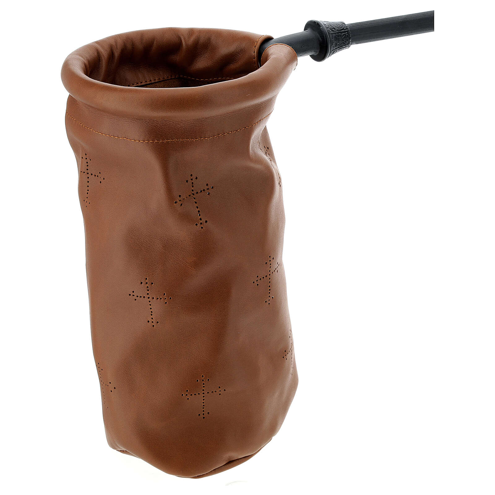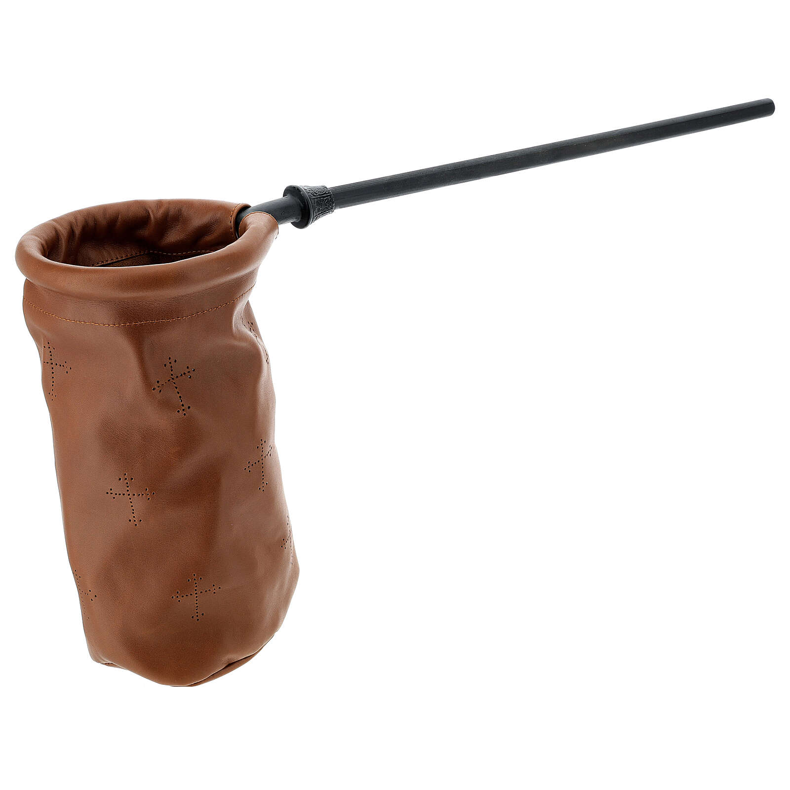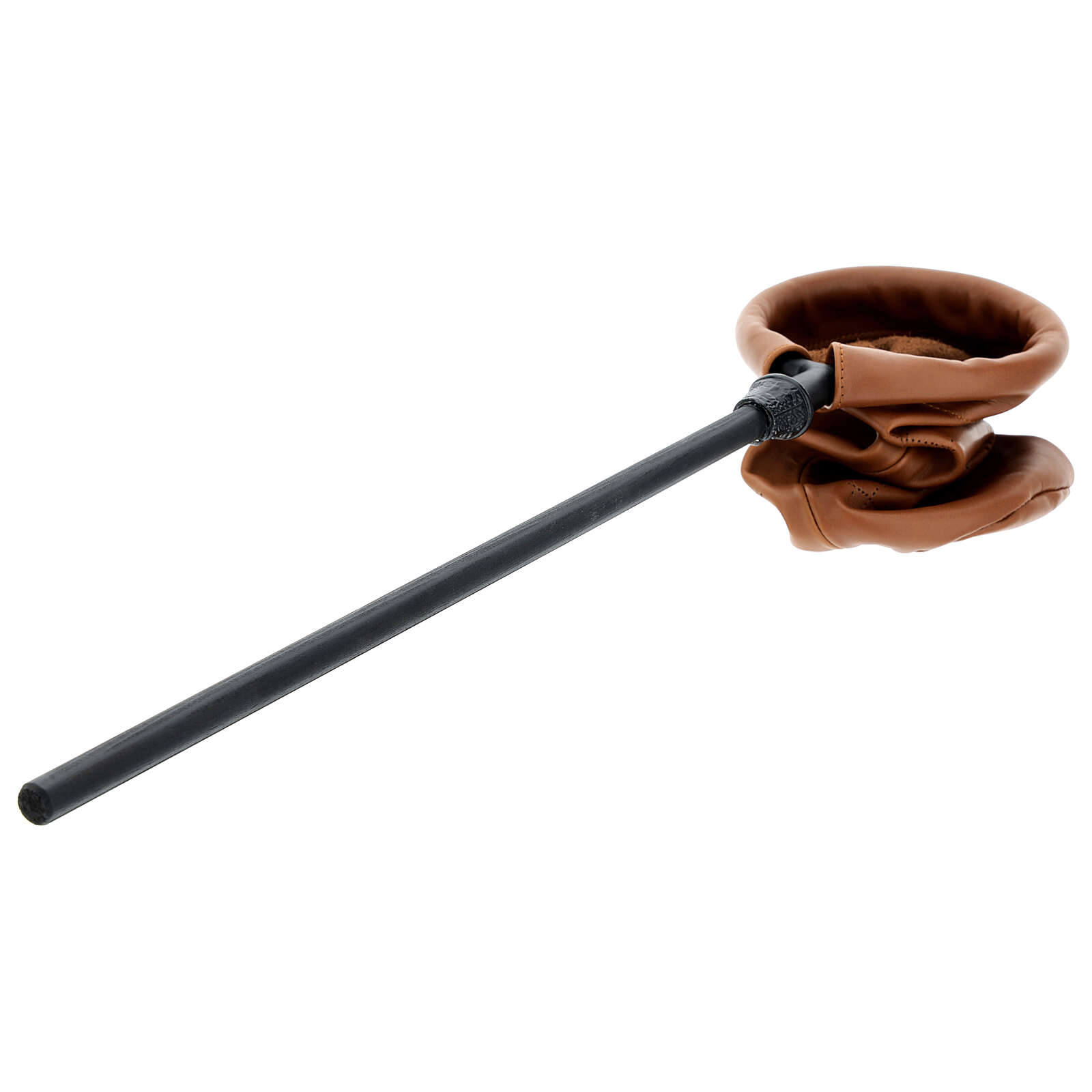 Bolso cilíndrico para colecta de cuero marrón de 14 cm de diámetro con mango de metal de 40 cm.