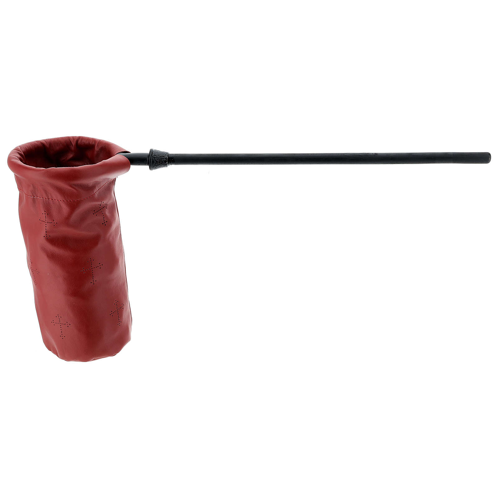 Bolso cilíndrico para colecta de cuero rojo de 14 cm de diámetro con mango de metal de 40 cm.