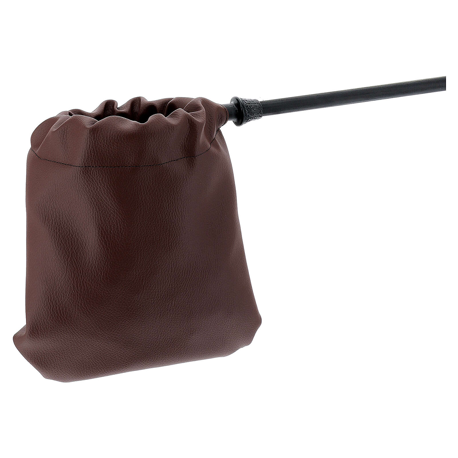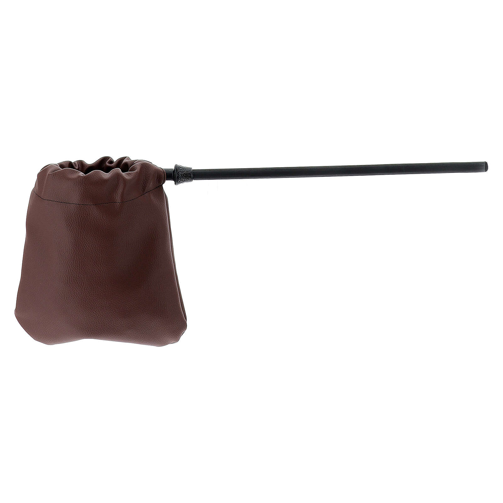 Bolso para colecta de cuero sintético marrón de 14 cm de diámetro con mango de metal de 40 cm.