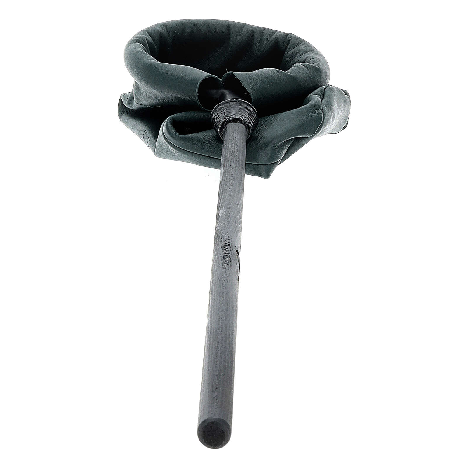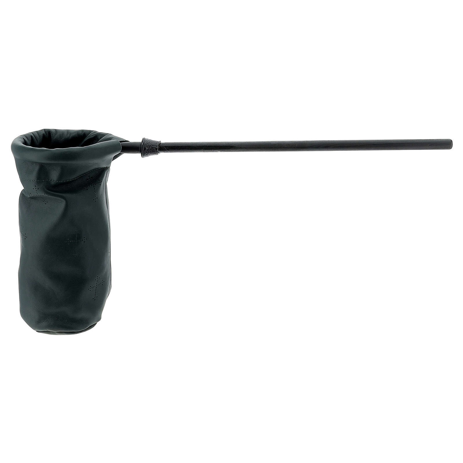 Bolso cilíndrico para colecta de cuero verde de 14 cm de diámetro con mango de metal de 40 cm.