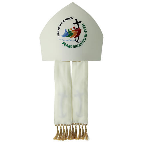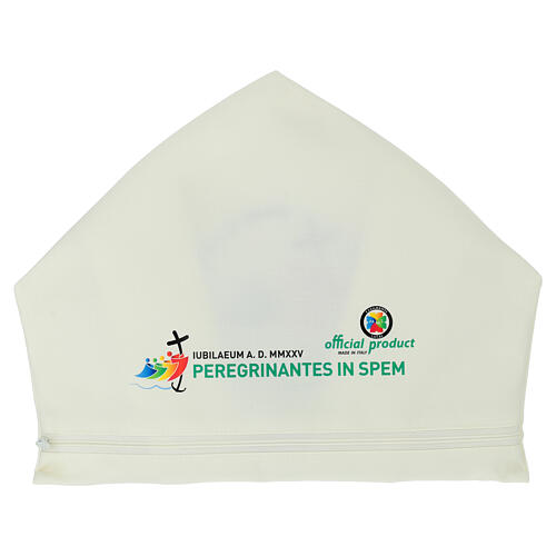 Mitra de 100% poliéster de color marfil, otorgándole un aspecto solemne y elegante, y con logotipo oficial del Jubileo 2025 en latín bordado en hilo de algodón.