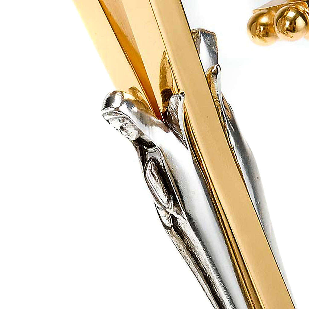Báculo pastoral con asta. La asta es de latón plateado mientras la extremidad doblada es de bronce plateado en la que está aplicado un crucifijo. El pastoral se hace artesanalmente en una pequena empresa italiana con 51 años de historia. Los dibujos originales, la alta calidad de los materiales empleados y las trabajaduras manuales, hacen de cada artículo un producto único.