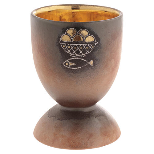 Cáliz de cerámica de 15 cm de altura con panes y peces y con interior dorado cerámico.