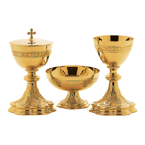 Conjunto compuesto por copón, patena para ofrendas y cáliz, de diseño elegante y con motivos de uva y trigo en relieve en la base; la copa del cáliz está además enriquecida con una franja grabada a mano.