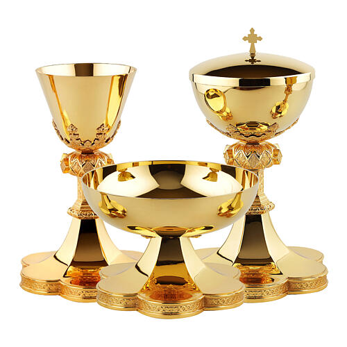 Cáliz, copón y patena para ofrendas en estilo gótico de latón dorado.