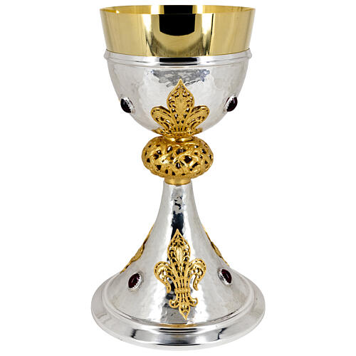 En la superficie exterior de la base destacan lirios realizados en filigrana aplicados al cáliz, acompañados de piedras incrustadas de color rojo.