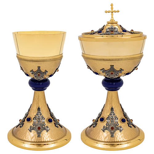 Cáliz y copón dorados martillados con filigrana francesa y piedras sintéticas.