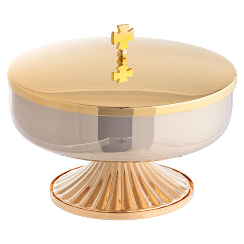 Copón de 12,5 cm de altura con cruz dorada en la tapa incluida y un diámetro de 16 cm, tiene una capacidad de aproximadamente 150 hostias.