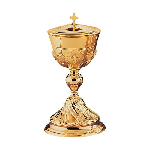 Copón Molina de latón dorado, enriquecido con base torcida y medallones en la parte inferior de la copa.
