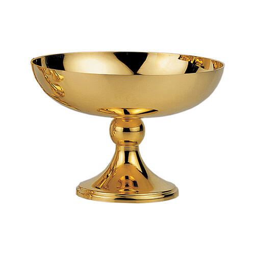 Piezas de latón con acabado en oro de 24 quilates por la reconocida empresa española Molina. La patena para ofrendas mide 13 cm de alto y tiene un diámetro de 21 cm.