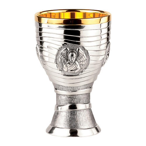 El conjunto presenta decoraciones en relieve plateado con la figura de un ángel que rodea ambas piezas.