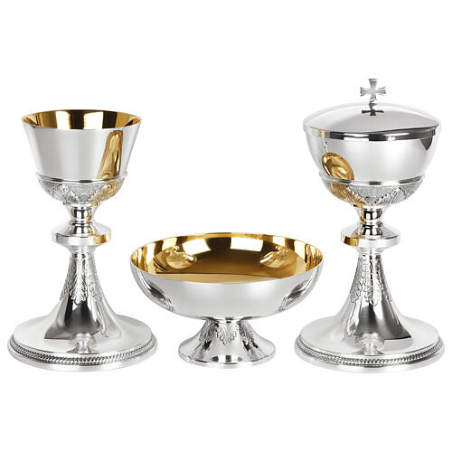 Conjunto compuesto por cáliz, copón y patena para ofrendas de diseño clásico y equilibrado, con motivos de hojas en relieve en la base de la copa y bajo el nudo.