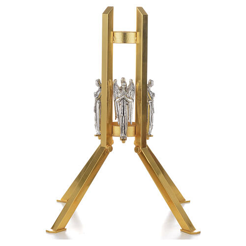 Base portacirio de latón dorado. El basamento está enriquecido por 4 angelitos plateados. De esta misma línea puedes encontrar: bases portacirios, cruces de paredes, lámparas de mesa. Este artículo se hace en manera artesanal en una empresa italiana especializada en la elaboración de objetos liturgicos. Los diseños originales, la gran calidad son las caracteristicas de esta línea de productos.