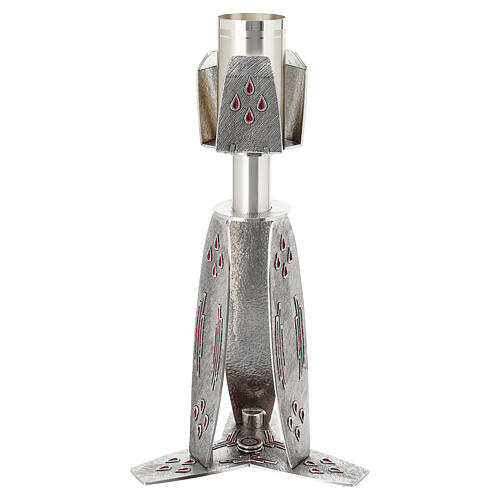 Base portacirio plateado con esmaltes. De esta misma línea puedes encontrar: bases portacirios, cruces de paredes, lámparas de mesa. Este artículo se hace en manera artesanal en una empresa italiana especializada en la elaboración de objetos liturgicos. Los diseños originales, la gran calidad son las caracteristicas de esta línea de productos.
