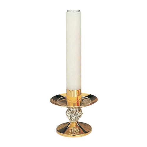 Candelero en latón dorado con base baja con decoración de uvas plateadas.