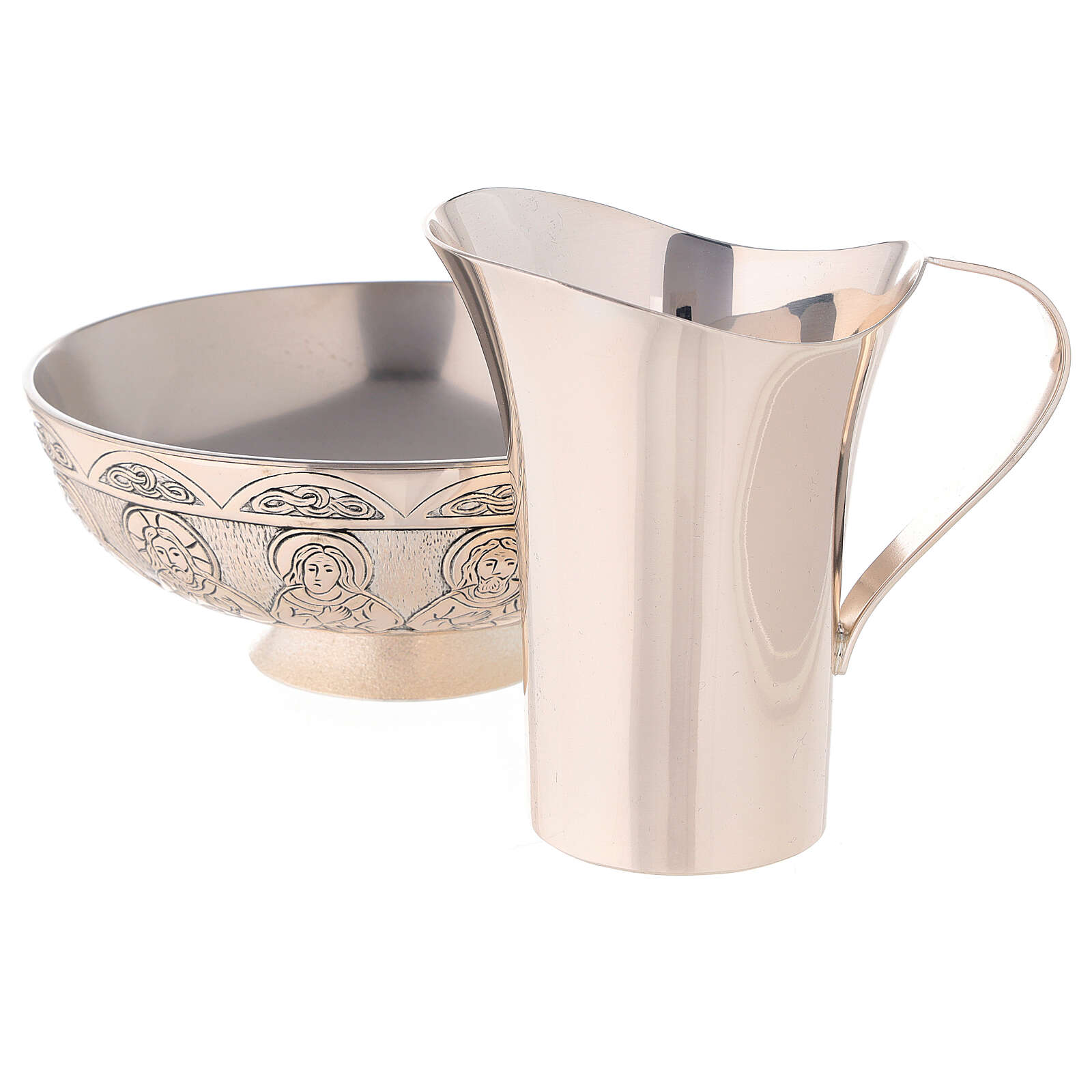 Jarra para manutergio con plato Molina latón plateado. Precioso conjunto de jarra y cuenco con lavamanos realizado por la famosa empresa española Molina, que hace artículos religiosos de primera calidad siguiendo técnicas artesanales. Este producto hace parte de la colección "Artimetal".