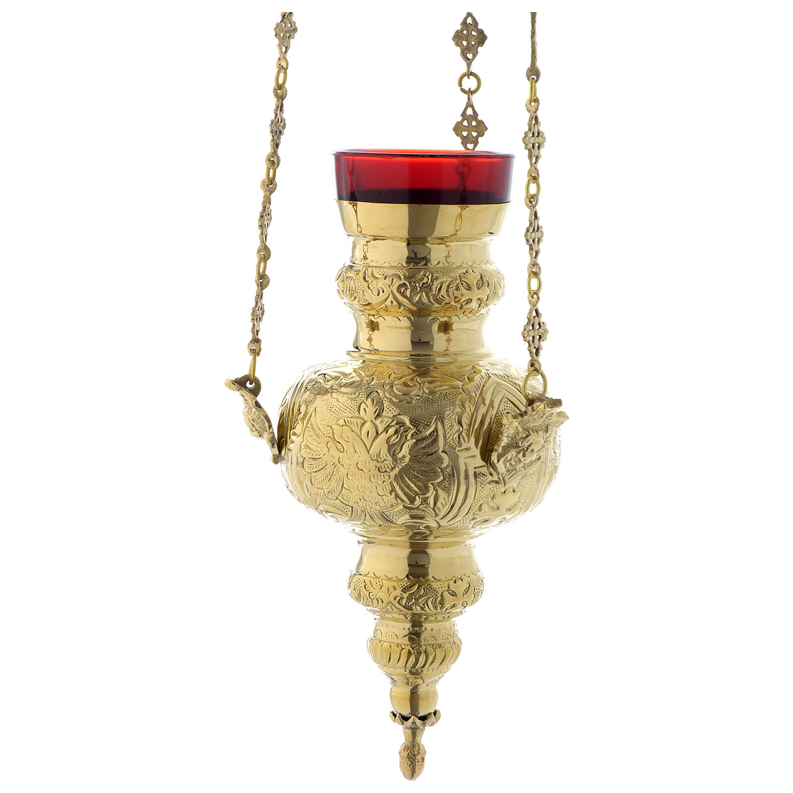 Lámpara en suspensión de latón dorado de 60 cm con motivo de hojas y vidrio rojo rubí incluido.