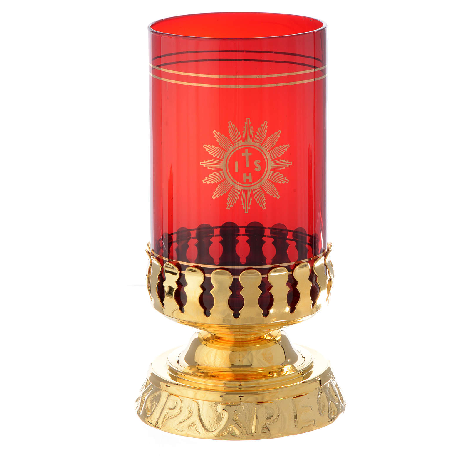 Lámpara para el Santísimo con base fundida para vidrio rojo rubí y medio vidrio de 7,5 cm de diámetro.