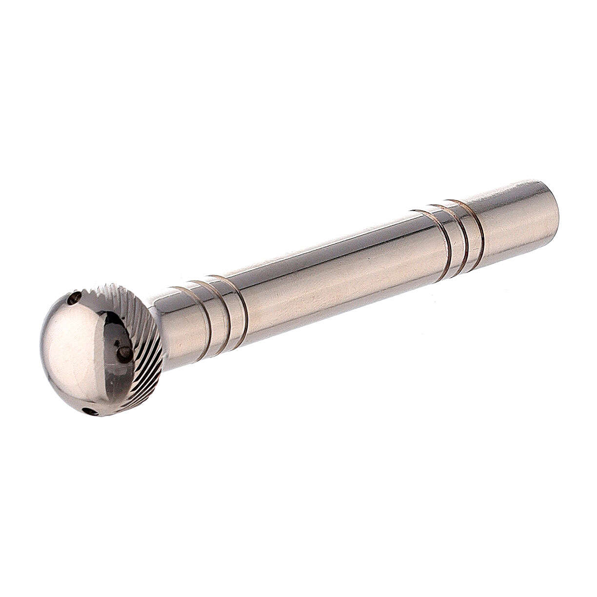 Tiene un portaviático esmaltado, asperges,una crismera, una pequeña cruz y una estola.
