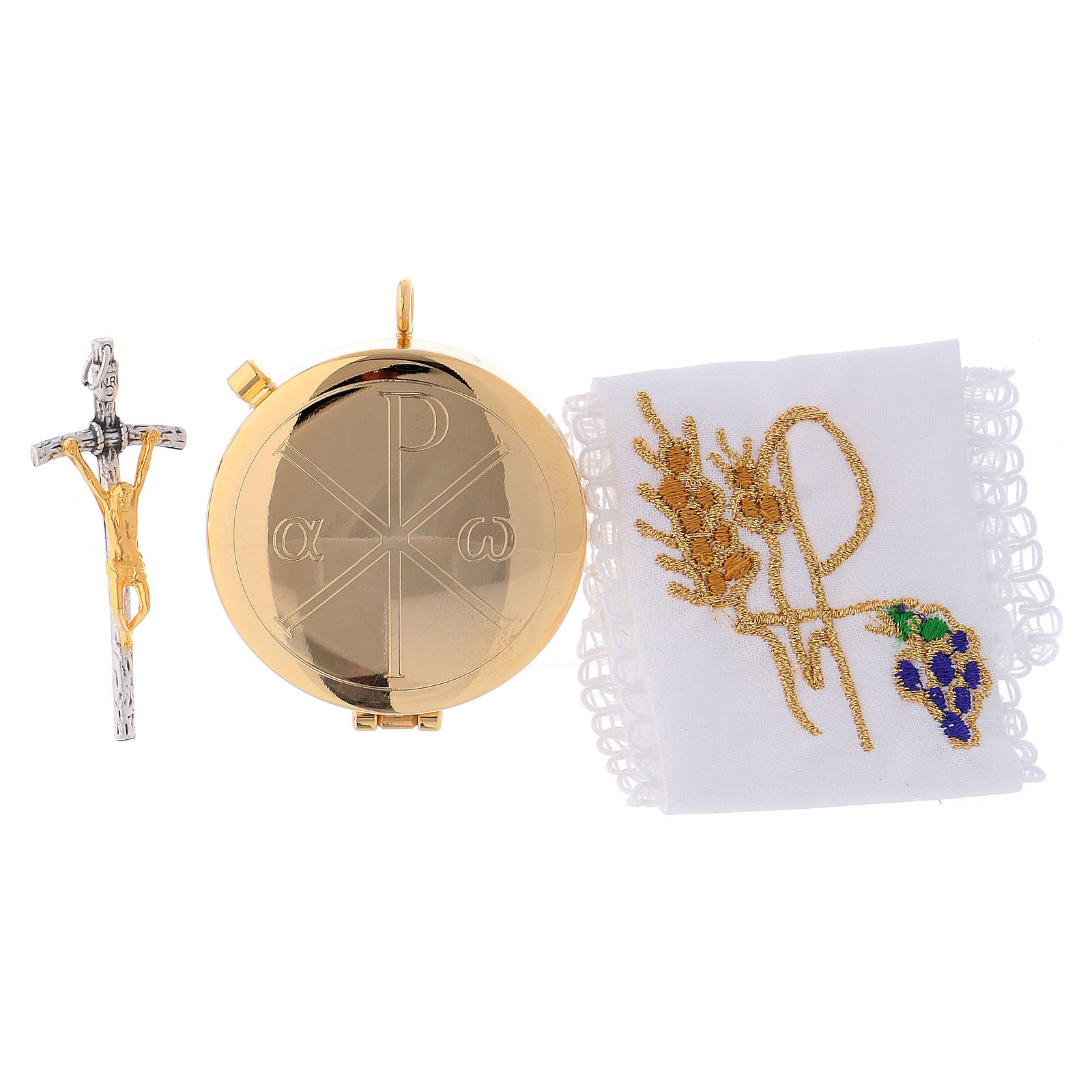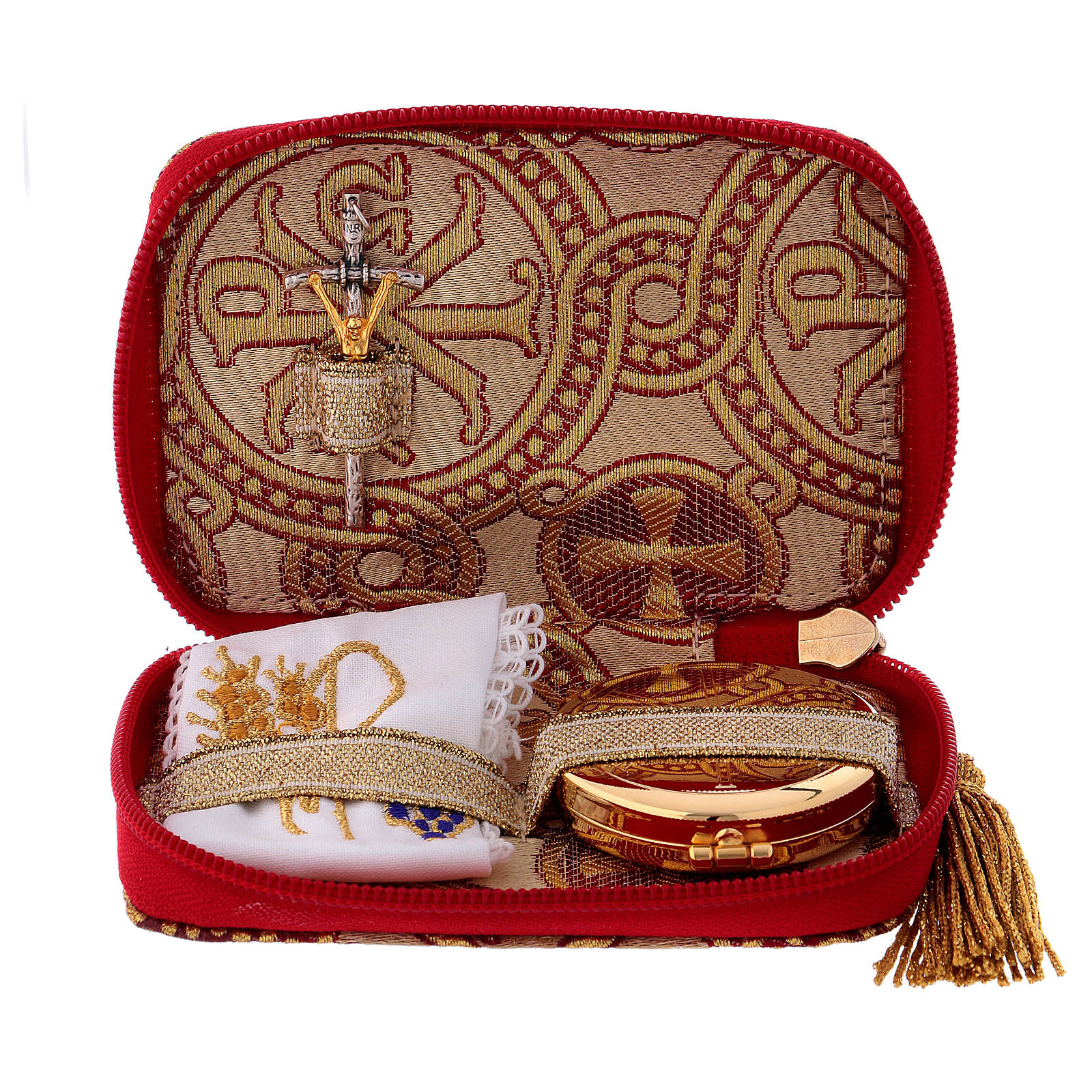 Estuche de tejido brocado y relicario de latón dorado para 10 hostias, manutergio de 100% algodón con bordado, frasco para santos óleos y estola bicolor.