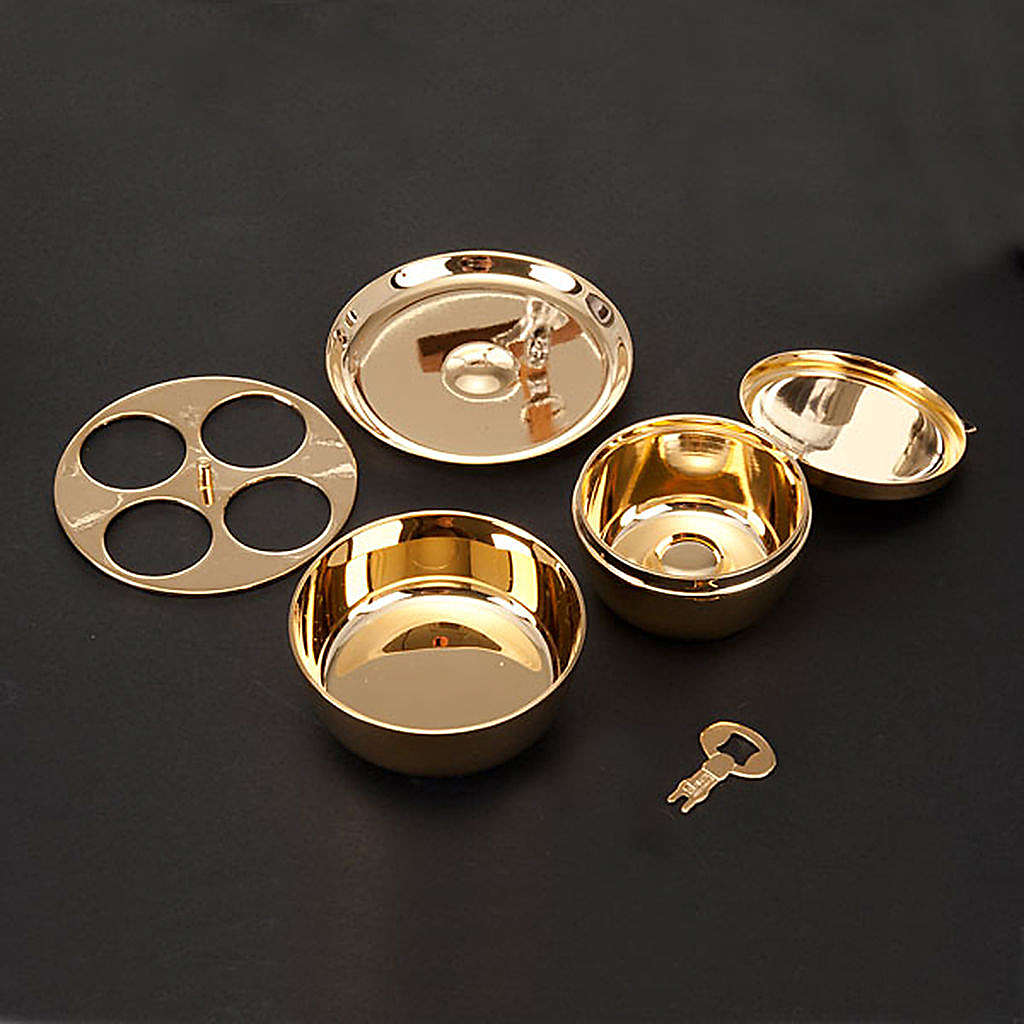 Estuche pequeño para celebraciones en diferentes ambientes. Muy pequeña, por lo tanto de excepcional practicidad durante los viajes. Completado por viáticos, este estuche presenta además un cáliz componible de excelente capacidad, una cajita para las hostias pequeñas y la patena.