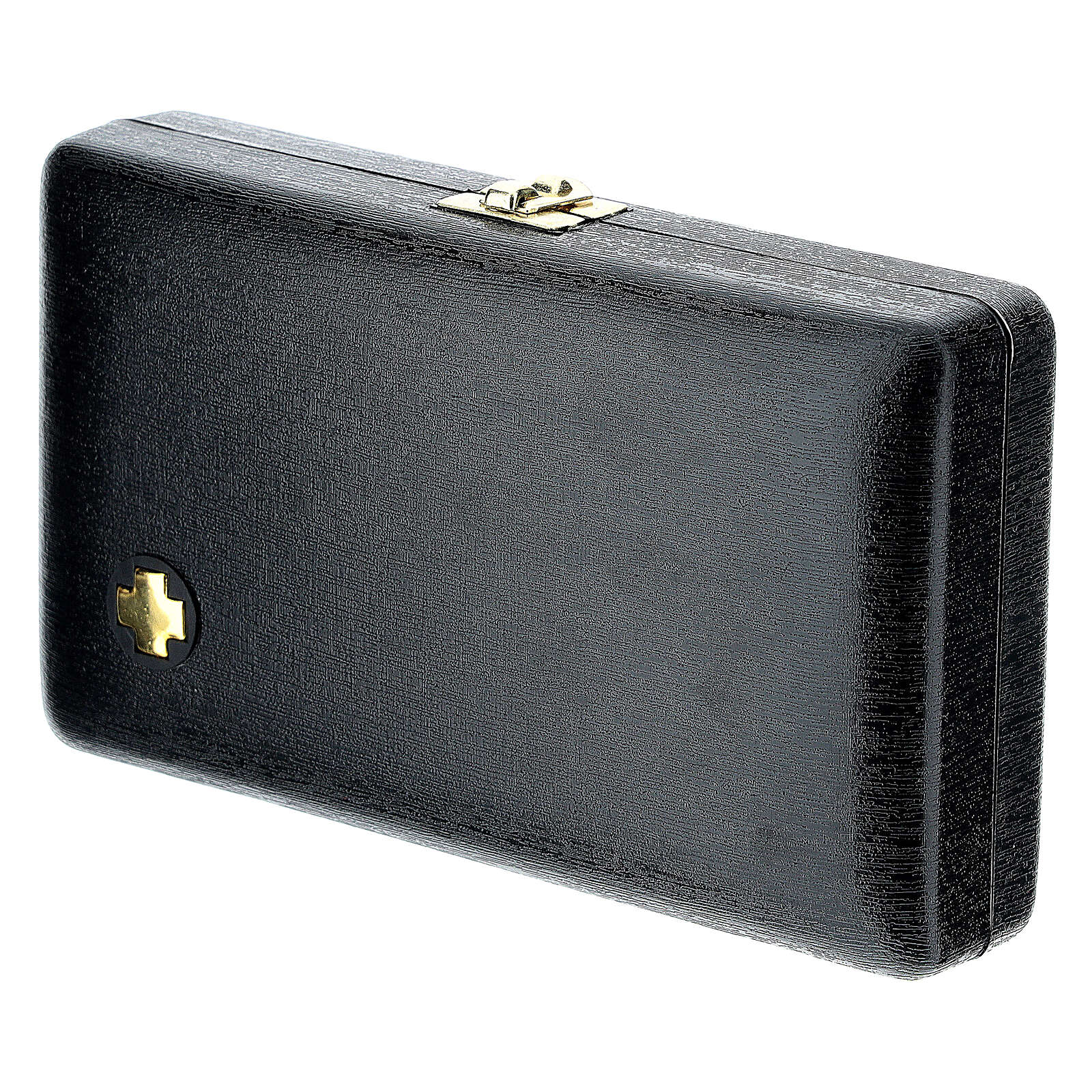 Estuche rígido de color negro en el exterior, en el interior el tejido es rojo con accesorios para viáticos.