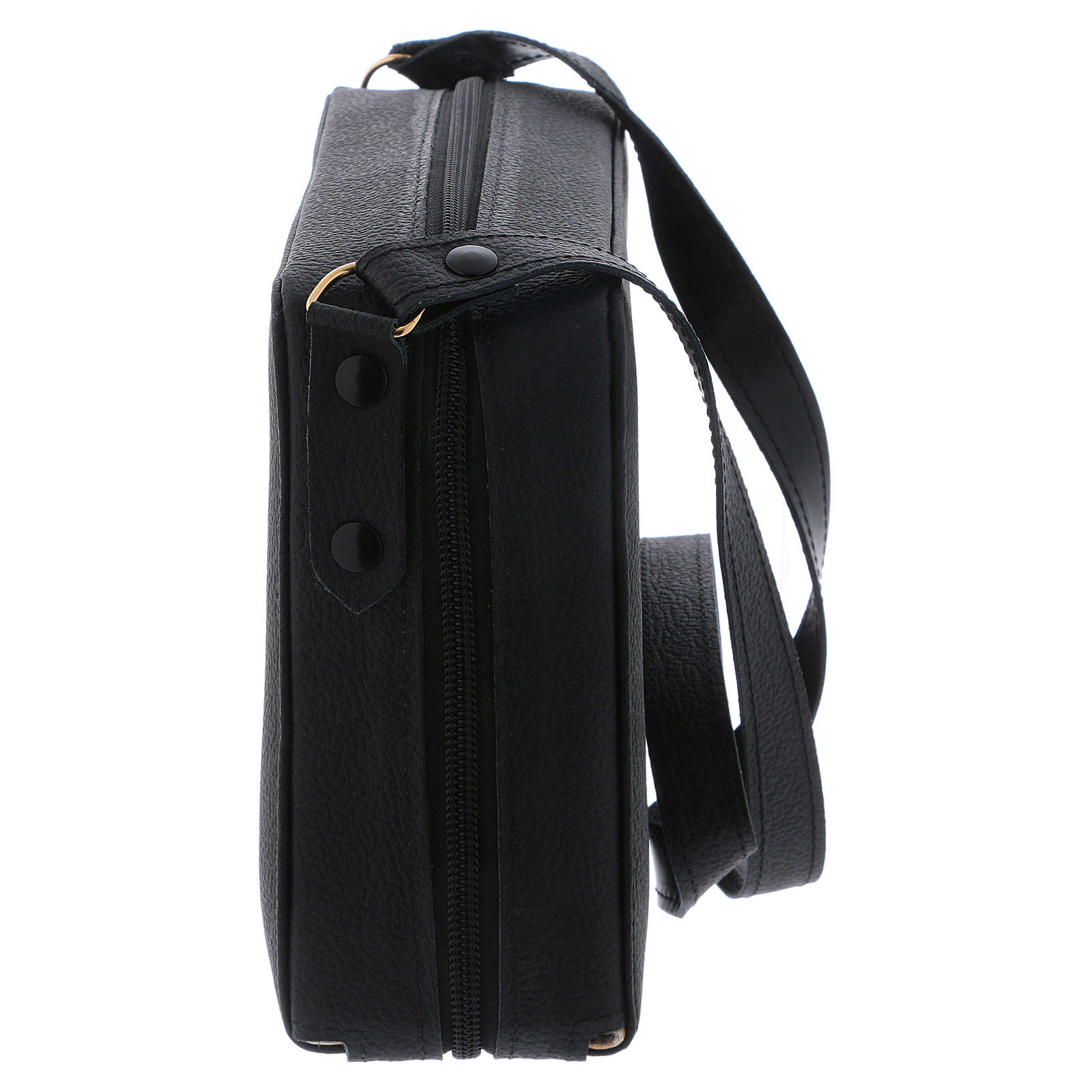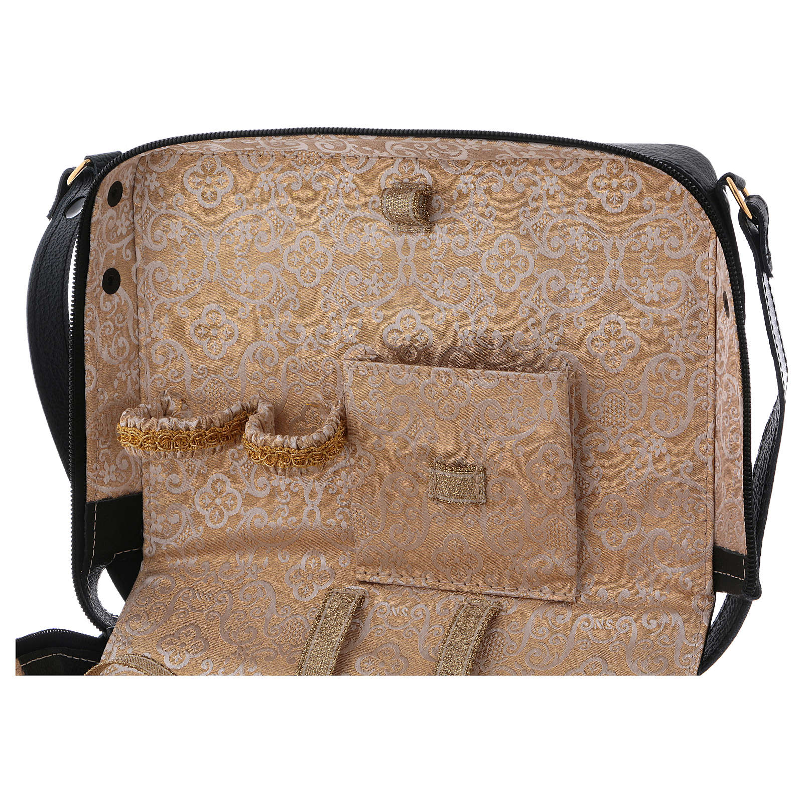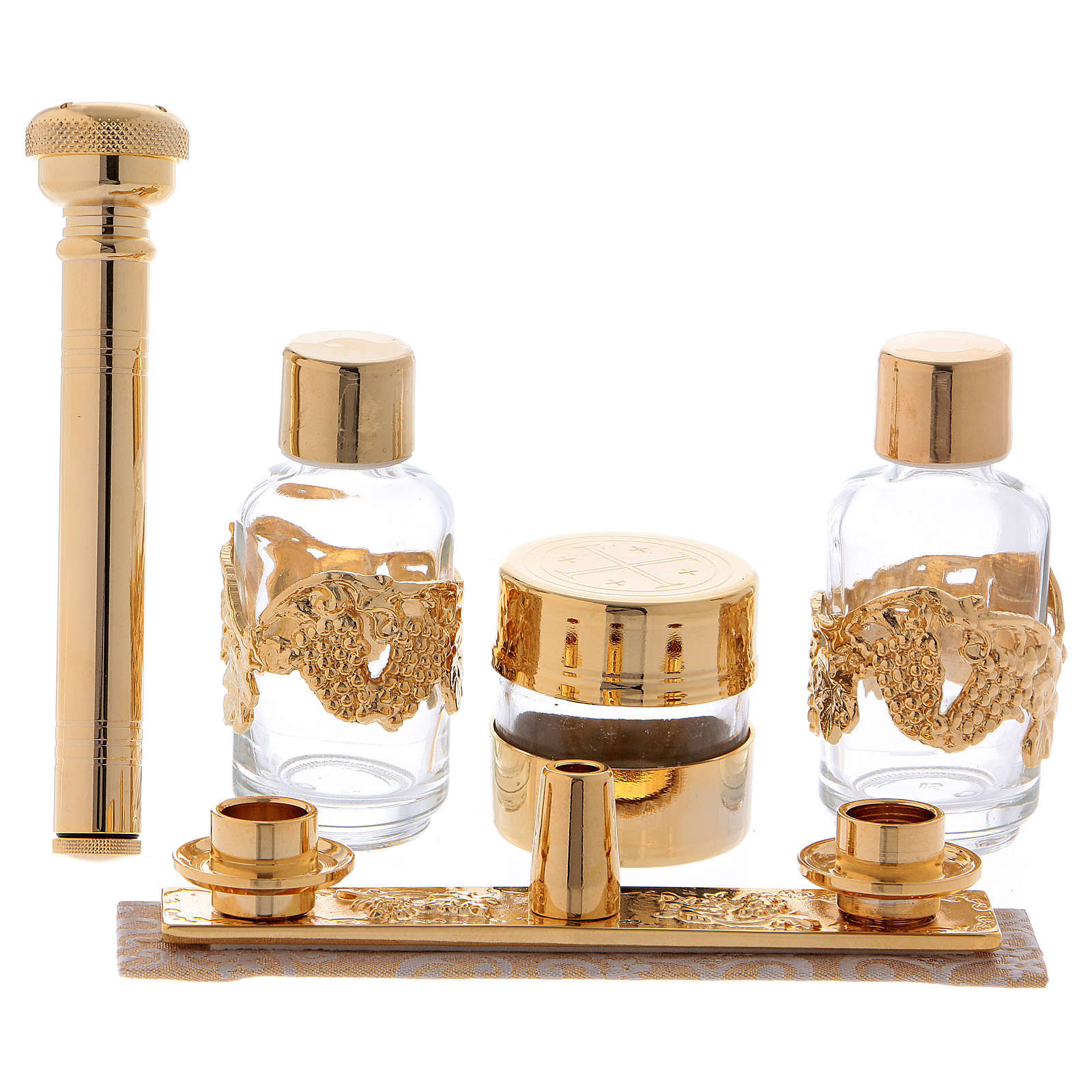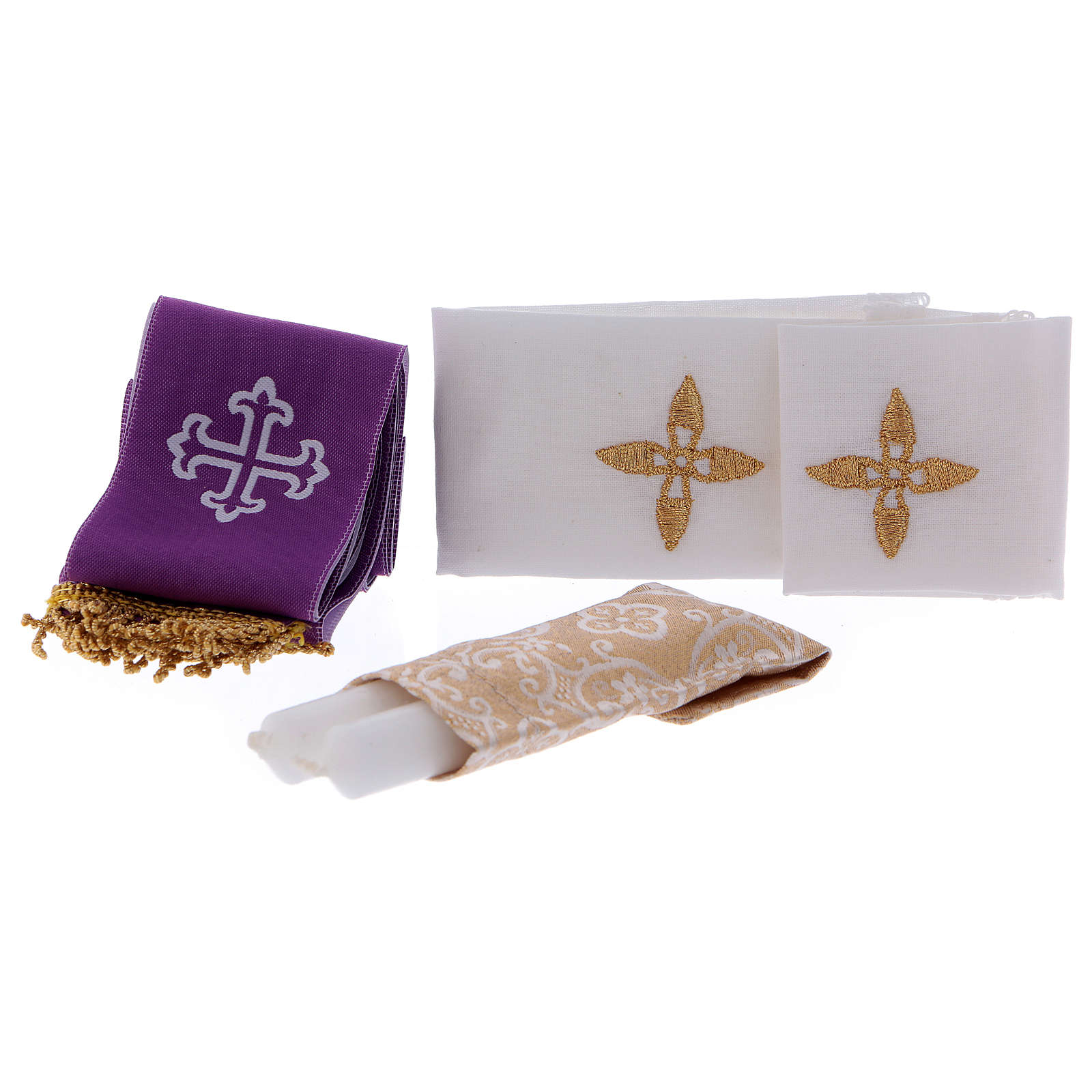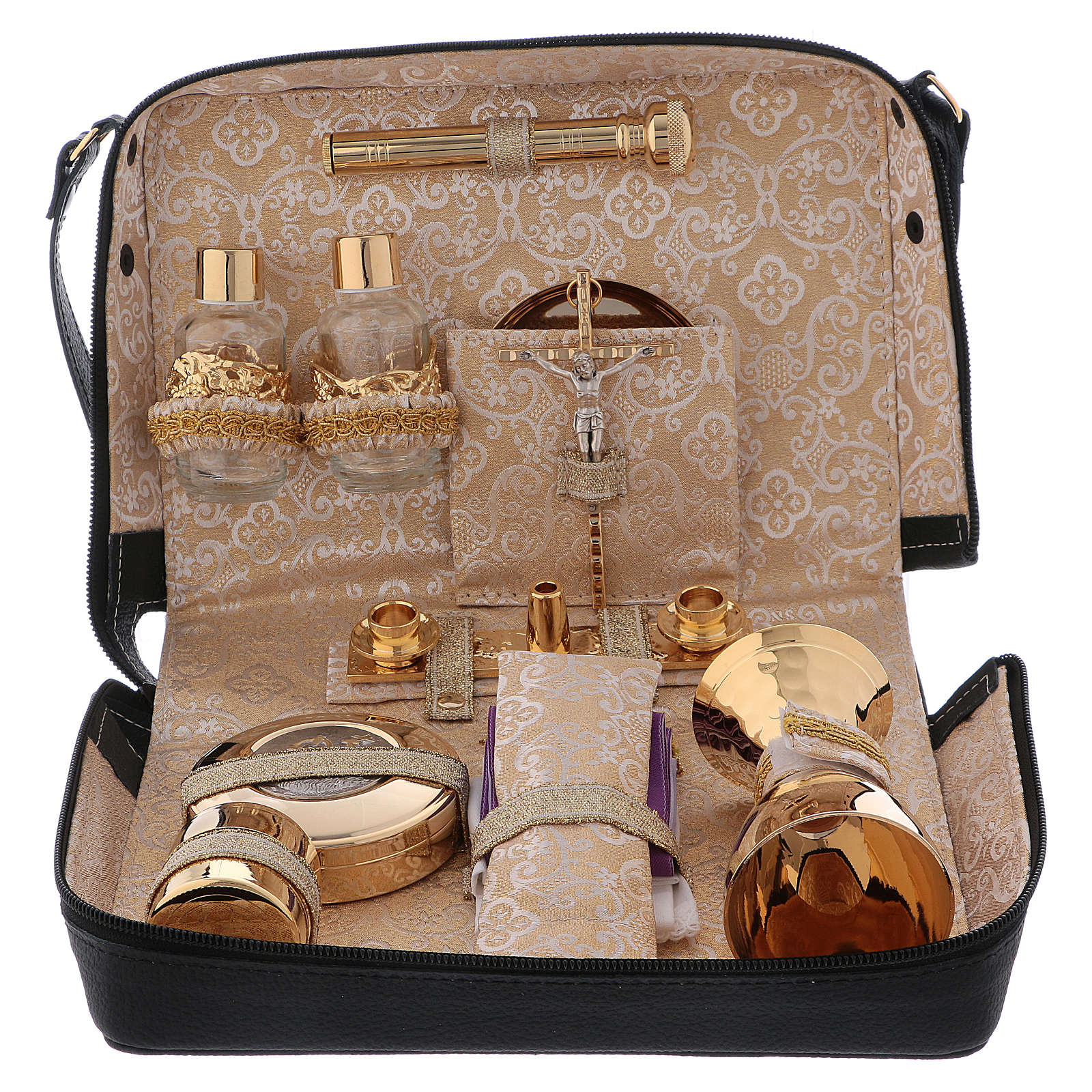 Bolso con cáliz de latón dorado 24 quilates, escudilla, caja para hostias con placa, altar con bases para la cruz y las velas, botellas de 30 ml para agua y vino, cruz bicolor, velas de cera, frasco para Santos Óleos, estola bicolor y set de manteles con cruz bordada.