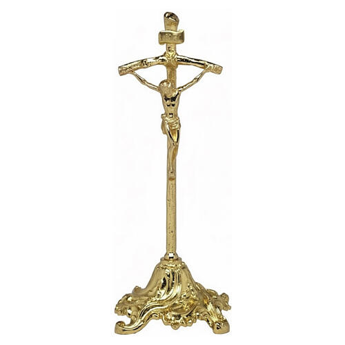 Cruz de altar de latón dorado de 30 cm, fabricada en Italia. Presenta la misma base de cuatro pies del candelero coordinado, enriquecida con un motivo floral en espiral que aporta elegancia y continuidad estilística al conjunto litúrgico.