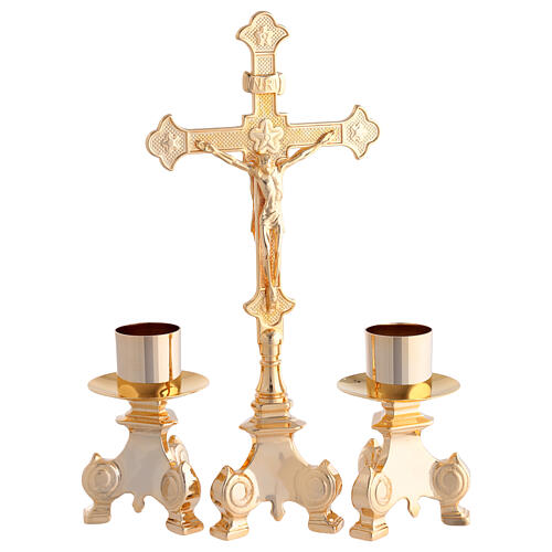 Conjunto de altar que consta de un crucifijo y dos portavelas de latón dorado. El crucifijo trípode presenta el cuerpo de Jesús en ambos lados y está coronado con el acrónimo INRI. Sus dimensiones son 33,6 x 15,5 cm.