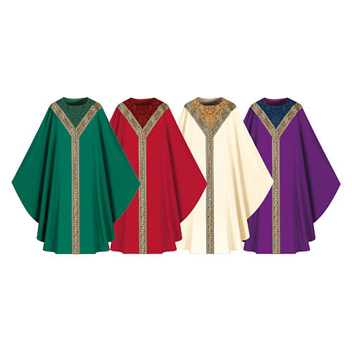 Casulla de 100% lana con entorchado y brocado realizada artesanalmente por el taller belga Slabbinck, esta casulla está elaborada completamente en lana.