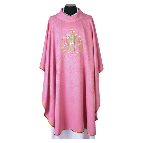 Casulla rosa JHS bordados dorados adamascada