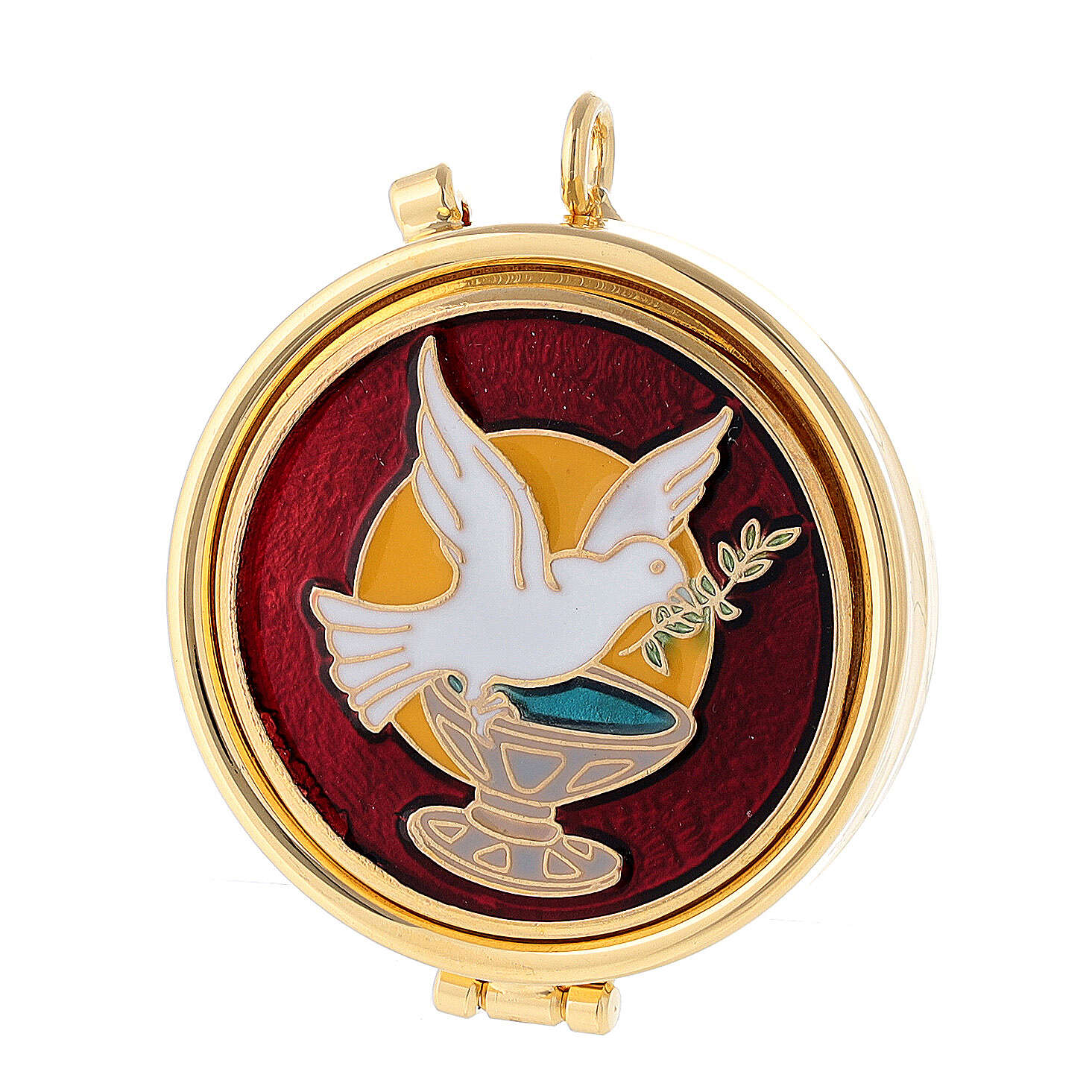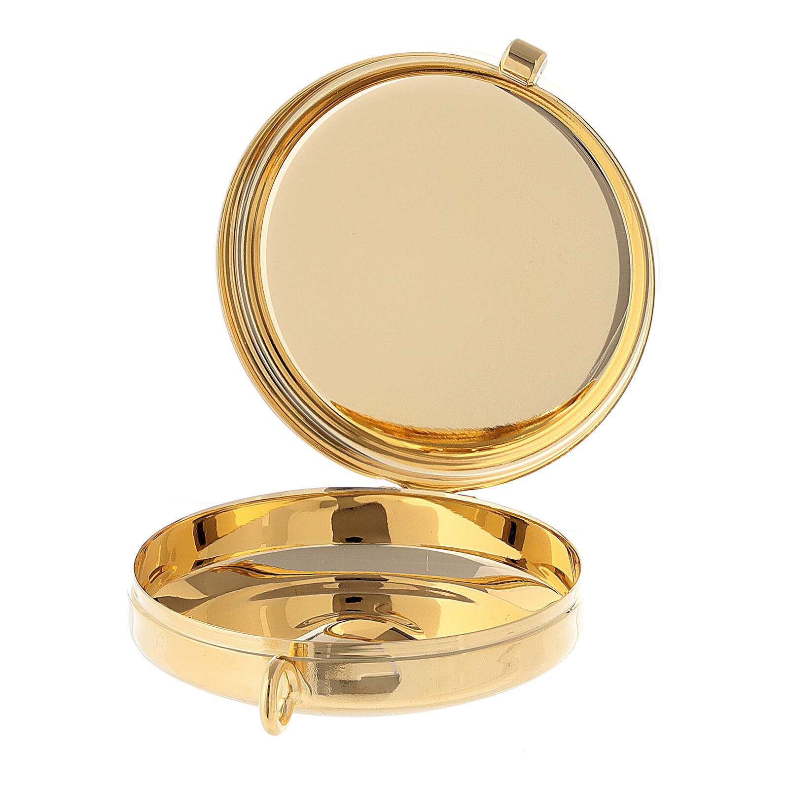 Caja de formas eucarístico de metal dorado para llevar las hostias consagradas a los enfermos.