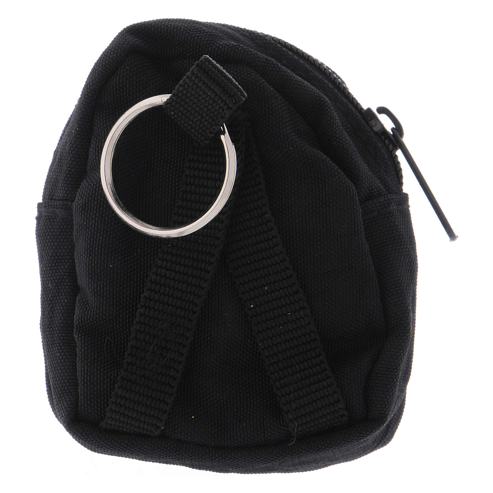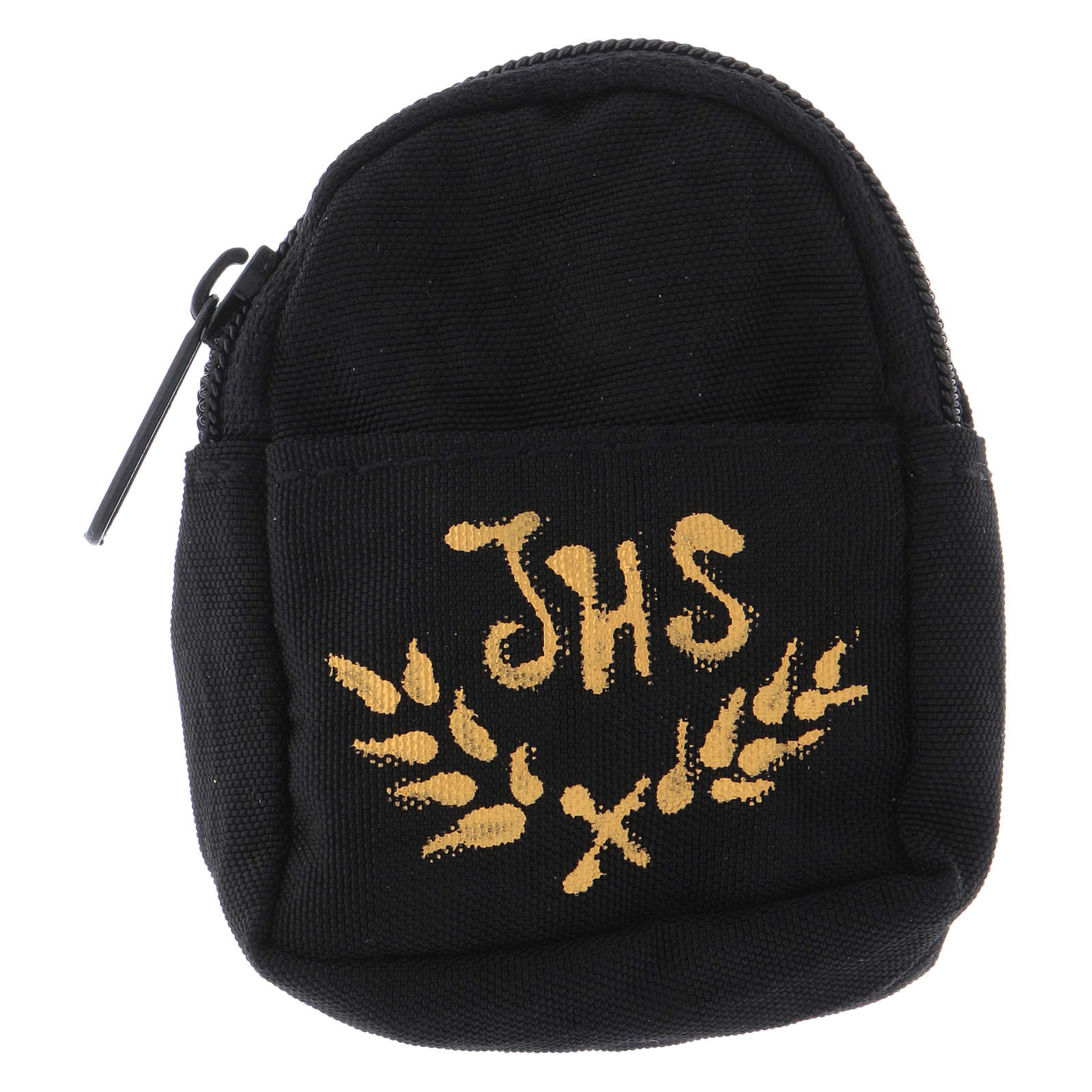 Mochila pequeña negra con relicario para la eucaristía de latón dorado 24 quilates y símbolo IHS.