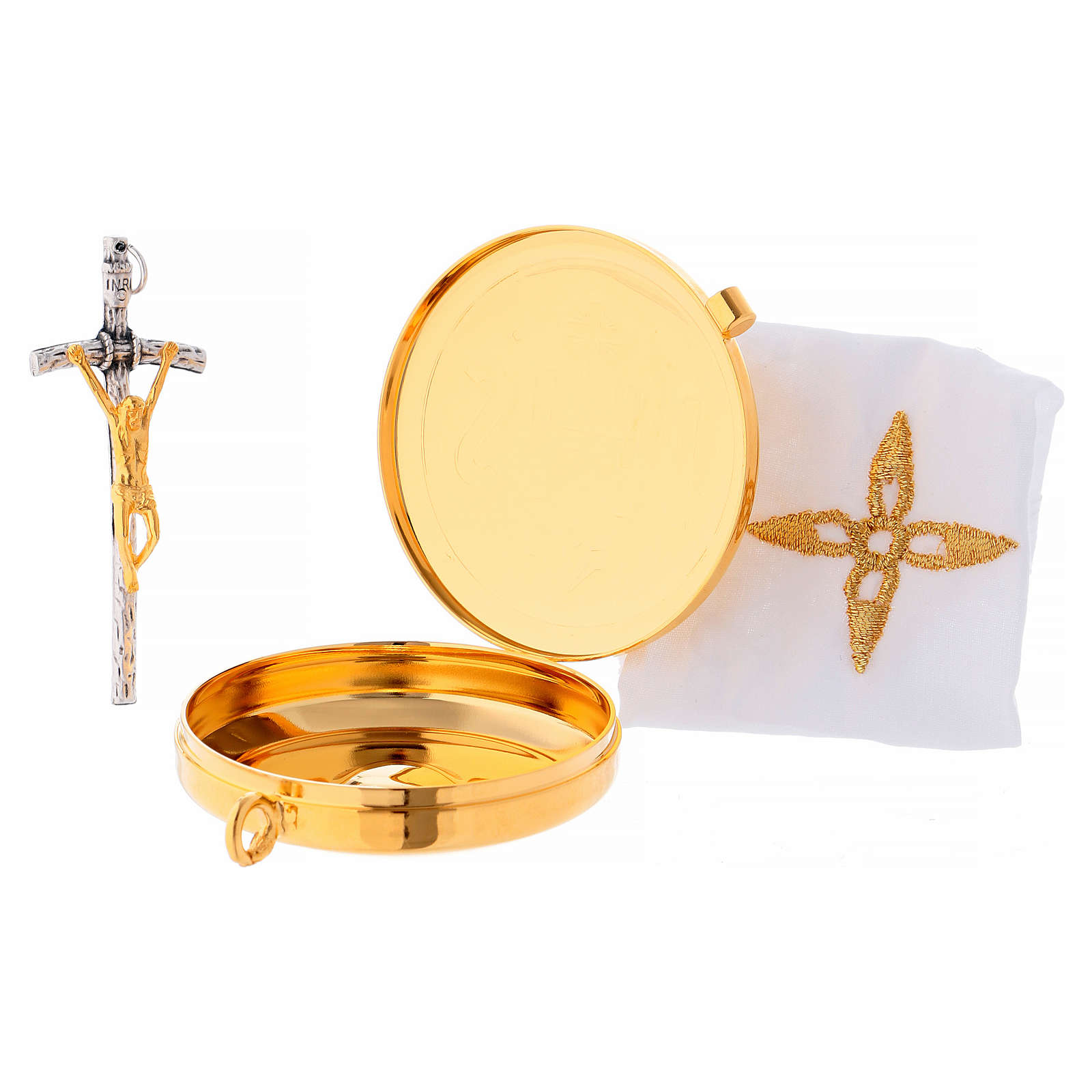 Mochila pequeña relicario cruz y pequeña servilleta con relicario latón