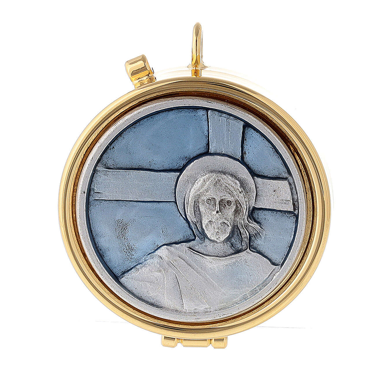 Porta-viáticos en latón dorado, posee una imagen con esmalte de "Jesús y cruz".