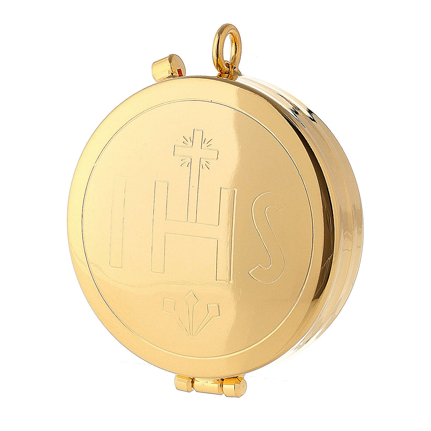Portaviatico eucarístico de latón dorado con grabado IHS en la tapa. Entregado con un anillo para llevarlo al cuello.