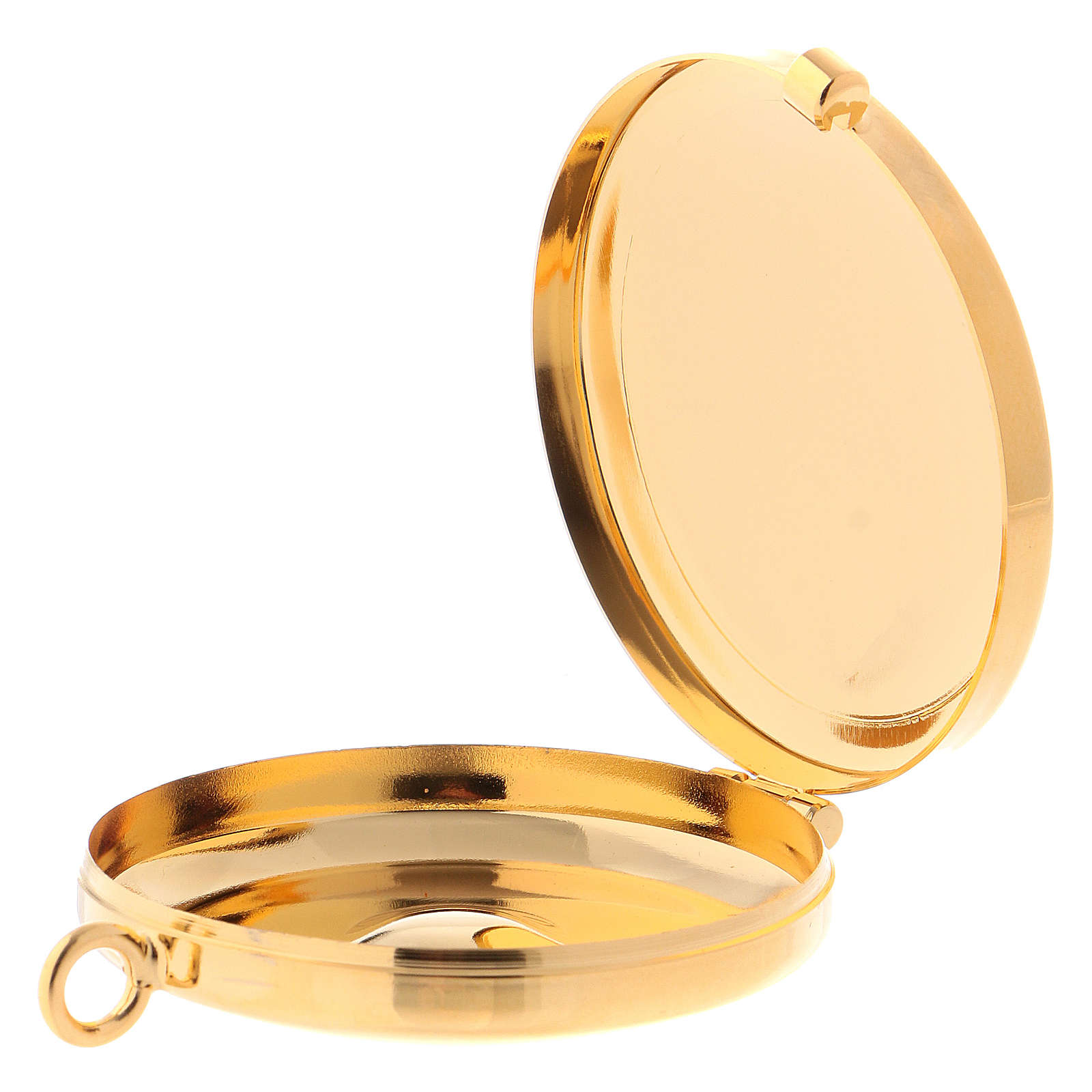 Relicario pequeño de 4 cm de diámetro para hostias con cruz e incisión IHS en la parte posterior.