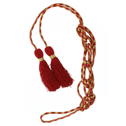 Cíngolo episcopal de color oro y rojo de 80% acetato y 20% algodón.Cíngolo con moño pulpo realizado por un taller artesanal en Italia.