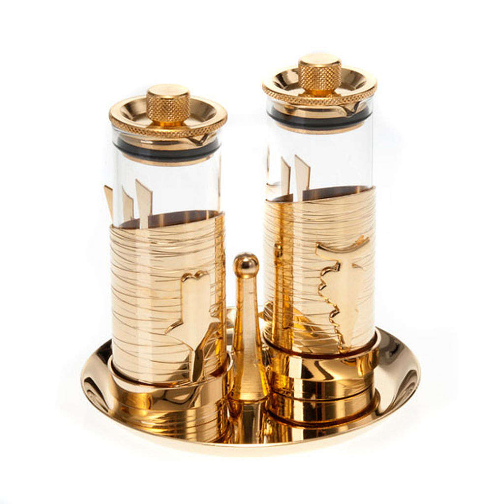 Es un set de vinajeras muy gracioso y funcional. Estas vinajeras son herméticas: de hecho hay que destornillar la tapa para abrirlas y si caen o se dan vuelta accidentalmente no pierden líquido. Estas vinajeras litúrgicas son perfectas para celebraciones al abierto. Agradables y seguras, de dorado inalterable.