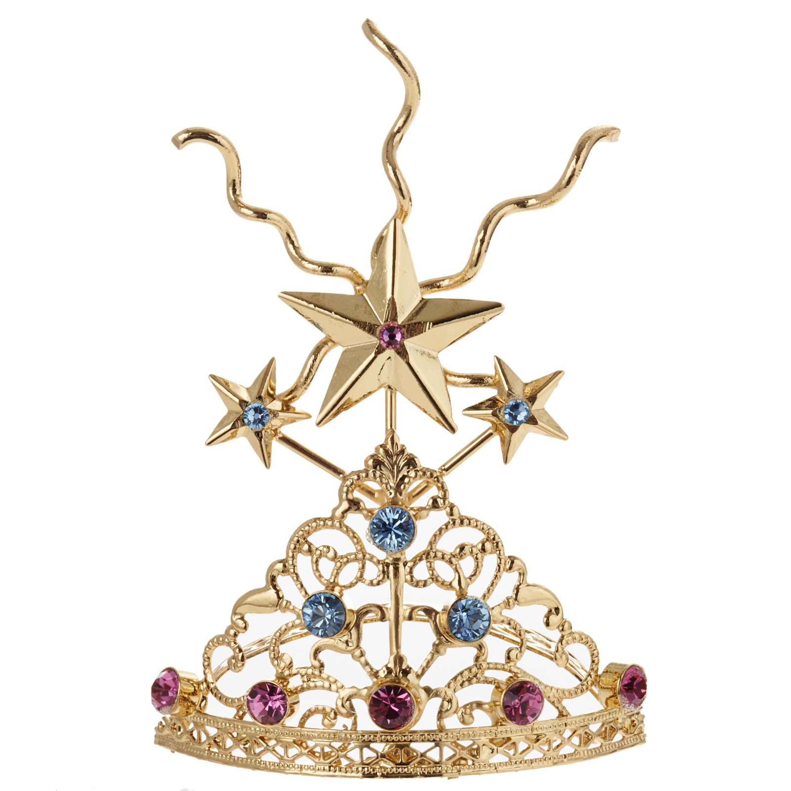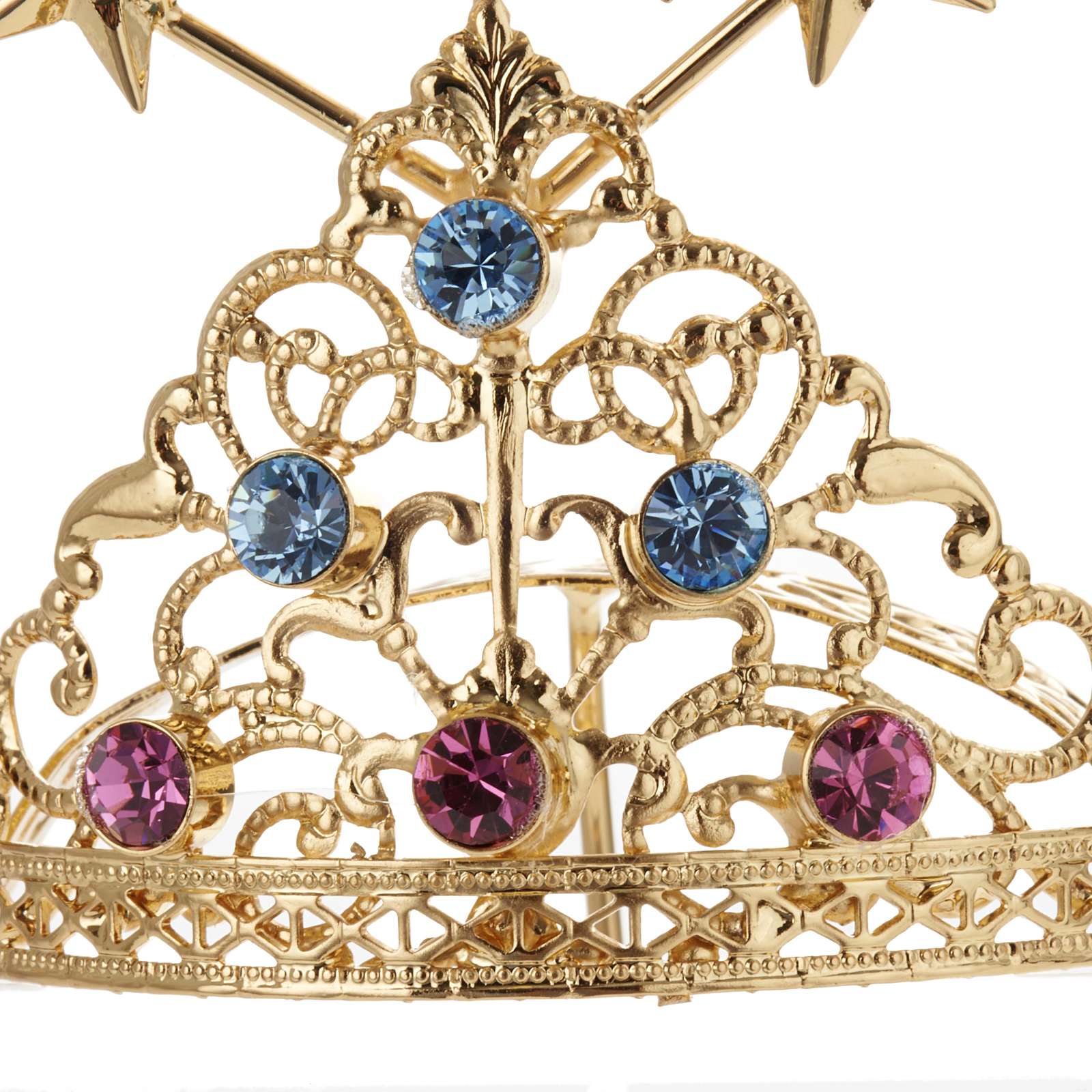 Corona para estatuas, es hecha en latón con filigrana dorada y pedrería de colores.