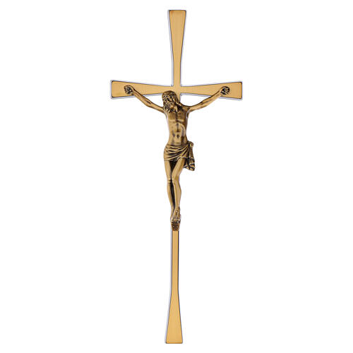 Crucifijo de pared bronceado, con figura de Cristo aplicada en estilo tradicional y los brazos de la cruz que se estrechan hacia el centro. Idóneo para uso exterior, protegido con un acabado especial contra la intemperie.