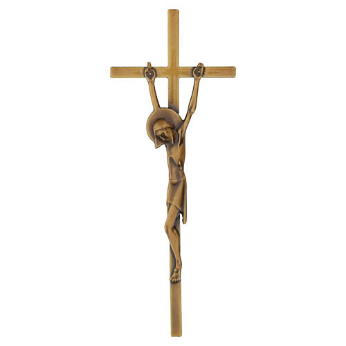 Cruz de pared de línea esbelta con figura de Cristo y acabado bronceado.