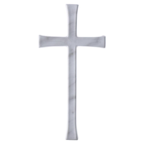 Cruz de pared con desarrollo vertical equilibrado y superficie compacta con acabado uniforme de mármol Carrara.