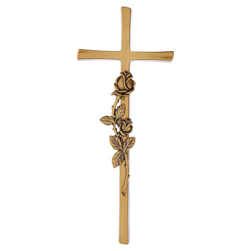 Cruz bronceada de pared indicada para uso exterior, constituida por una sencilla cruz latina con una aplicación en relieve de una rosa.