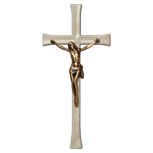 Cruz de pared con figura de Cristo de bronce y acabado efecto mármol Botticino.
