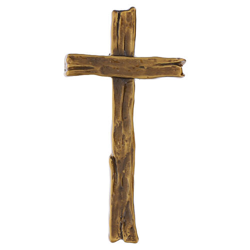 Cruz decorativa de pared con acabado bronceado, indicada para aplicaciones conmemorativas sobre superficies verticales.