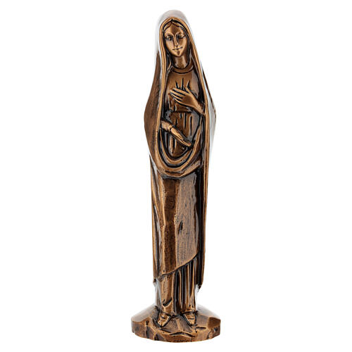 Estatua realizada en Italia en aleación de bronce pulido, protegida con una pátina brillante especial que permite su exposición al aire libre. Esta estatua representa a la Virgen con una mano en el pecho y otra dirigida hacia el fiel.