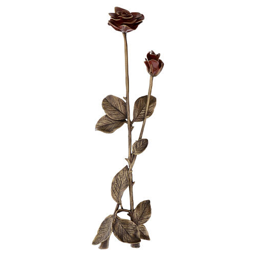 Fundición artística de dos rosas con tallo, hojas y espinas, con pétalos esmaltados rojos. La pieza se obtiene mediante la técnica de fundición a la cera perdida: una antigua técnica escultórica que permite crear ejemplares únicos. Se modela la escultura en cera, se fabrica el molde alrededor y la cera se elimina al verter el bronce fundido, quedando la obra definitiva.