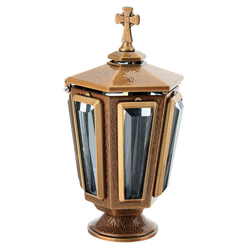 Lámpara diseñada para ser fijada al suelo con los pernos incluidos. Es elegante y presenta una cruz en la tapa y ventanas en las 6 caras con vidrio facetado de gran calidad.