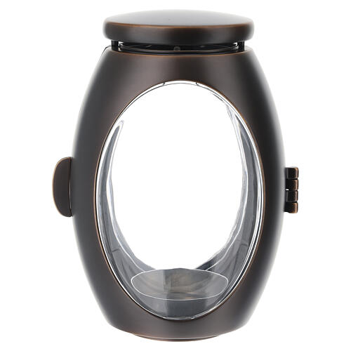 Lámpara para uso exterior en cementerios de metal con un acabado oscuro y construcción robusta.